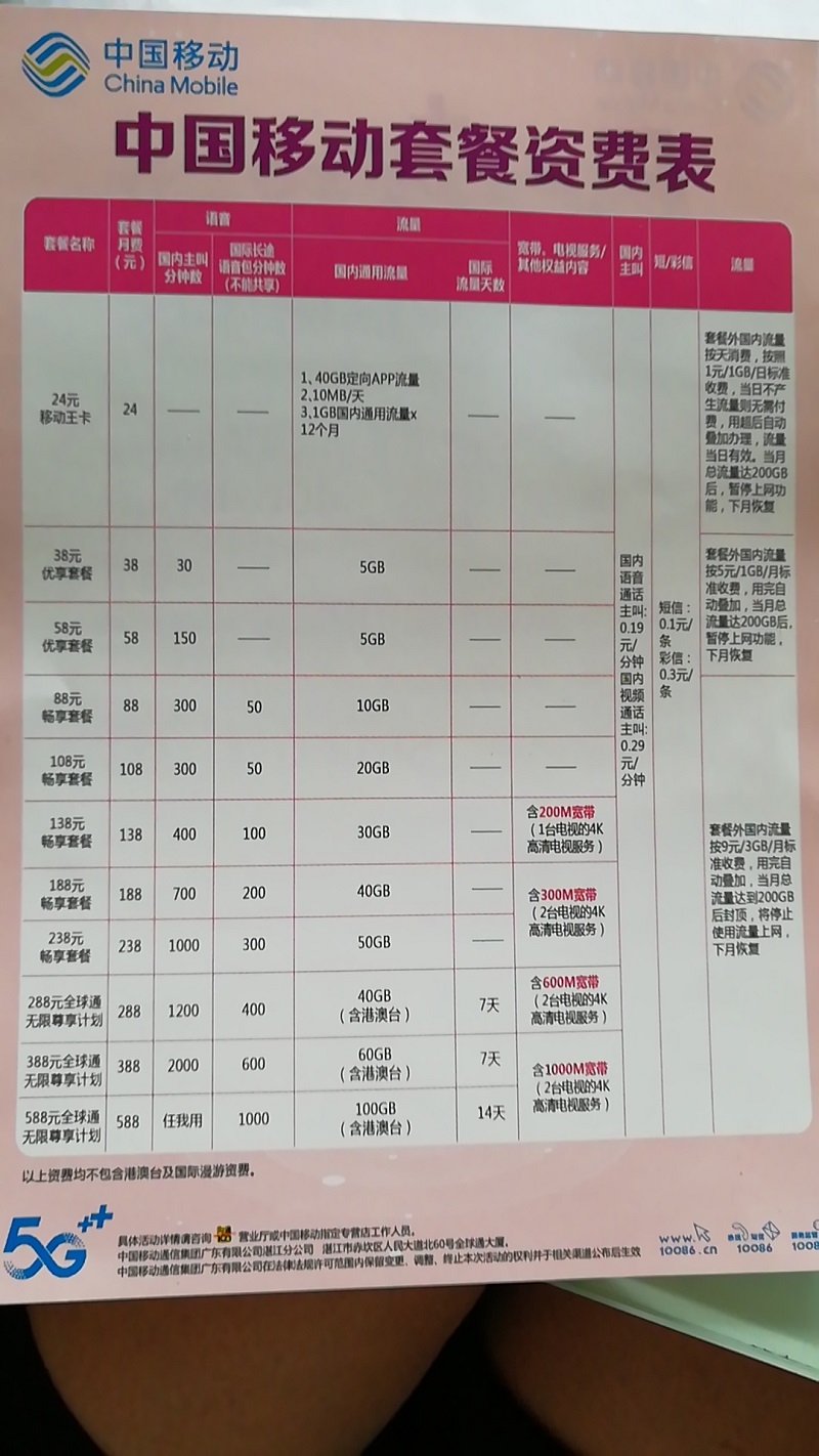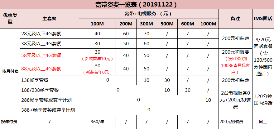 不限量套餐88元以上用户可0元使用100M光纤一年。